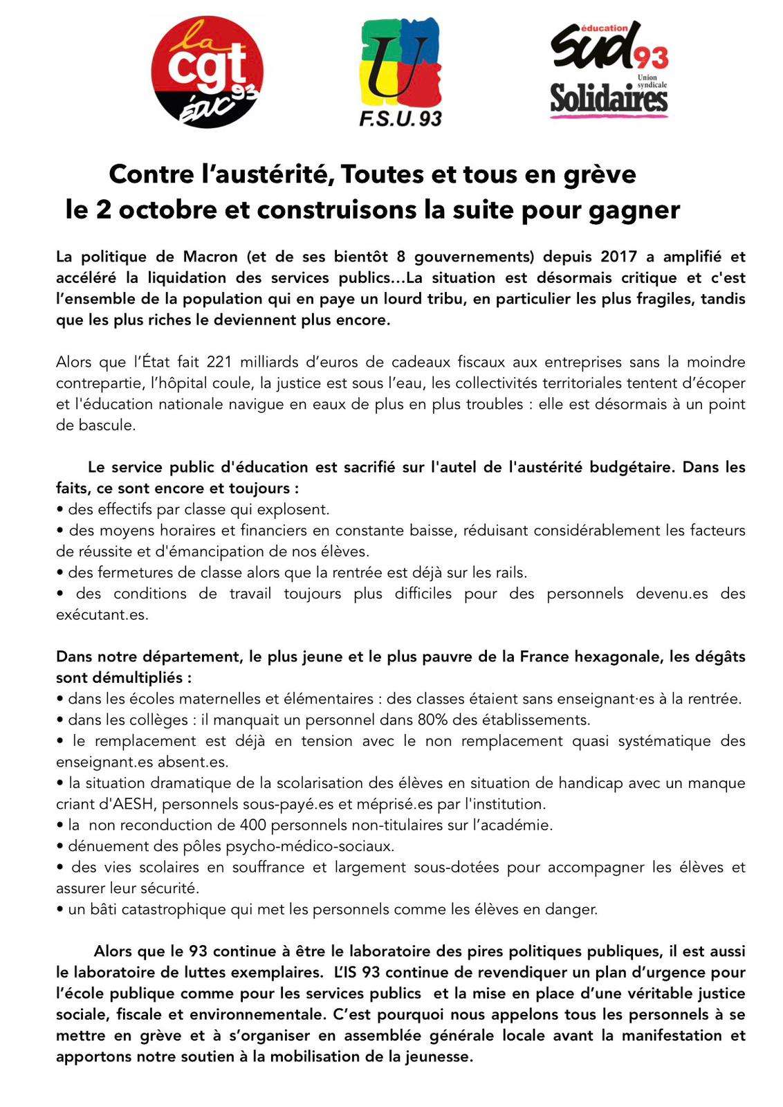 – Saint Denis : AG interpro jeudi 02/10 10h Bourse du travail