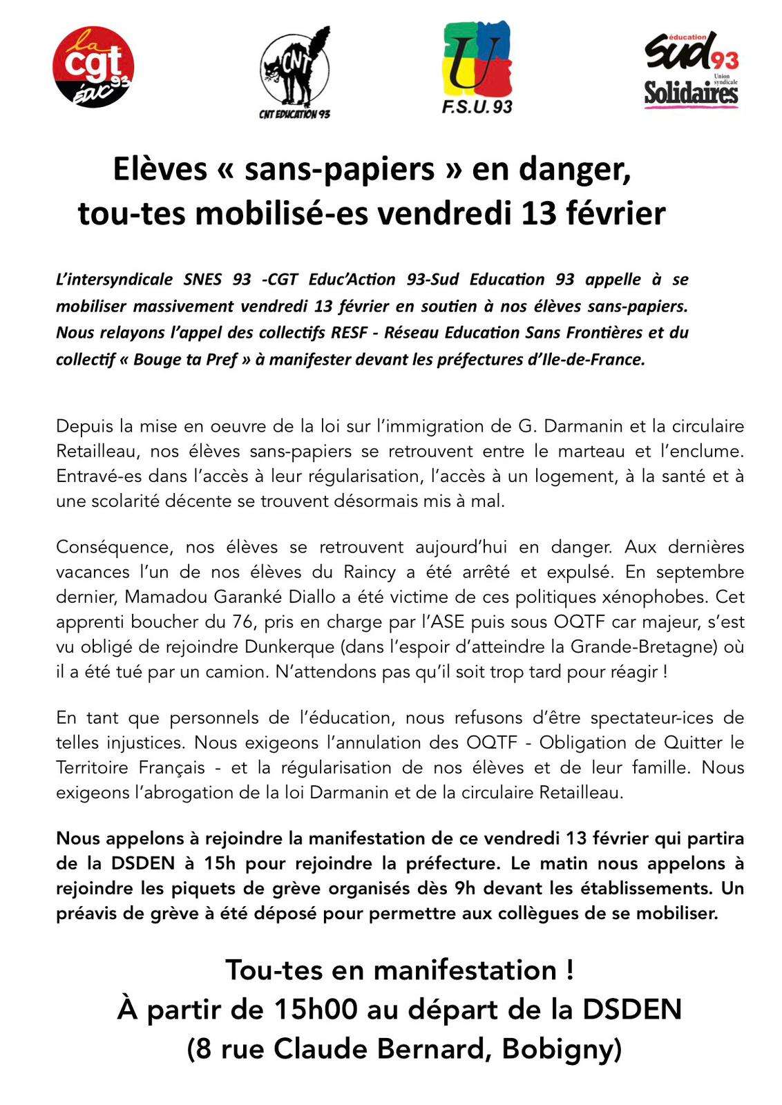 Elèves « sans-papiers » en danger : Tou-tes moblisé-es le 13 février ! 2026-02-04T15:56:14+01:004 février 2026|Catégories : À LA UNE| Le vendredi 13 février comme partout en Ile-de-France Manifestation à Bobigny 15 h du 9 rue Claude Bernard (DASEN) vers la Préfecture Partagez cet article ! FacebookXWhatsAppTelegramEmail Articles similaires Appel à la mobilisation des acteur.trices de l’éducation Face aux appétits de l’extrême droite, résister et renforcer l’école publique ! Appel à la mobilisation des acteur.trices de l’éducation Face aux appétits de l’extrême droite, résister et renforcer l’école publique ! 4 février 2026 8 mars : grève féministe Brisons les chaines sexistes du capital ! 8 mars : grève féministe Brisons les chaines sexistes du capital ! 4 février 2026 LA SEINE-SAINT-DENIS SE RASSEMBLE CONTRE LES IMPERIALISMES ET POUR LA PAIX ! LA SEINE-SAINT-DENIS SE RASSEMBLE CONTRE LES IMPERIALISMES ET POUR LA PAIX ! 1 février 2026 Communiqué : la mobilisation paie, la FSU avec l’intersyndicale impose l’ouverture de négociations aux ministères Communiqué : la mobilisation paie, la FSU avec l’intersyndicale impose l’ouverture de négociations aux ministères 29 janvier 2026 Communiqué du collectif Tour de France pour la Santé Communiqué du collectif Tour de France pour la Santé 27 janvier 2026