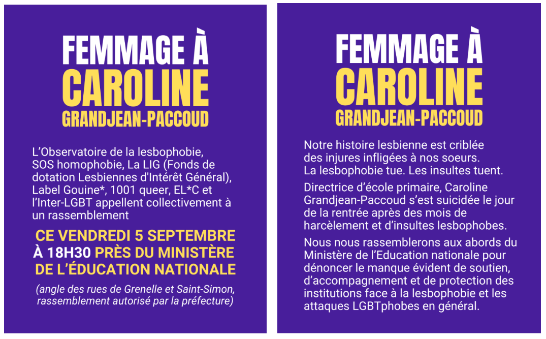 Un rassemblement aura lieu vendredi 5 septembre à 18h30 près du ministère de l’Éducation nationale, angle des rues de Grenelle et Saint-Simon, en femmage à Caroline, directrice d’école, qui s’est suicidée à la suite des violences lesbophobes qu’elle subissait.