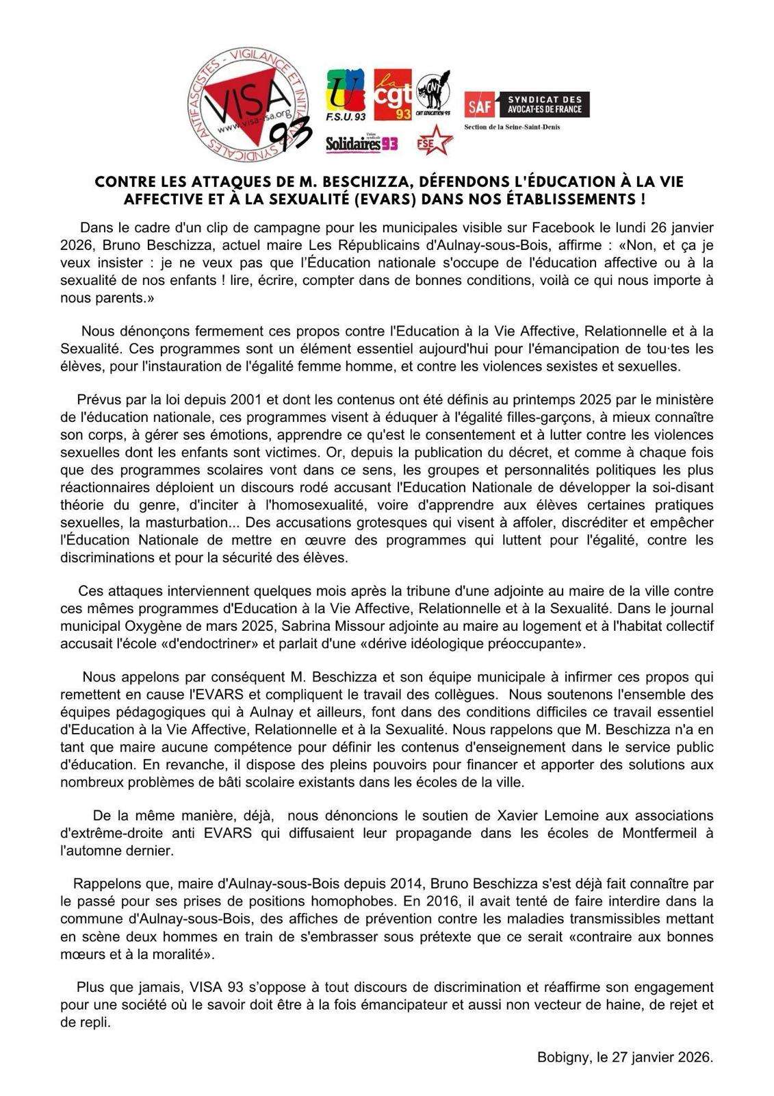 Pour outiller les équipes locales, plusieurs supports existent déjà : trame nationale VISA, communiqué FSU 93 Aulnay, article « Pour le 93 » sur Montfermeil, affiche VISA 93 pour Blanc-Mesnil. Nous invitons les militant·es à s’en saisir et à les décliner dans le cadre des intersyndicales locales afin de construire des ripostes collectives et visibles sur chaque territoire.